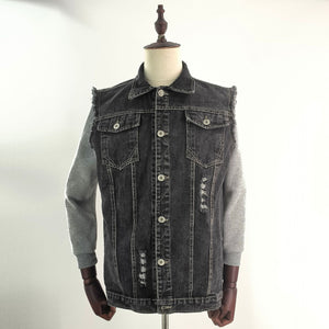 Trendy black and gray motorcycle denim vest for men. Sleeveless design and printed details add a bold, edgy style for bikers.