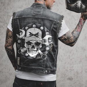 Upgrade your biker wardrobe! This sleeveless denim vest features a worn print and durable fabric for a rugged, stylish look.
