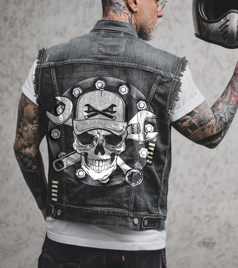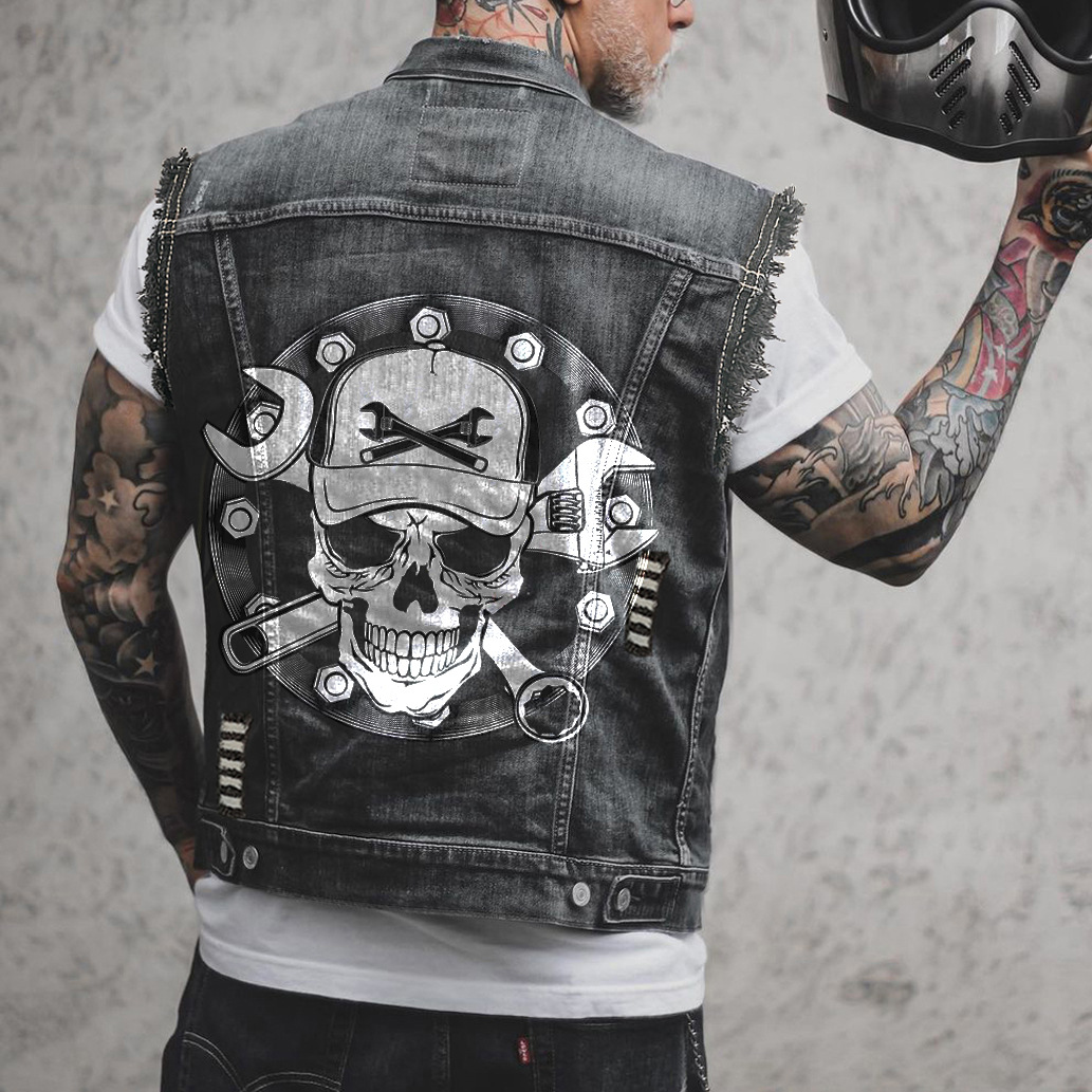 Make a statement with this motorcycle denim vest. Sleeveless, black and gray, with a rugged worn print – ideal for biker enthusiasts.
